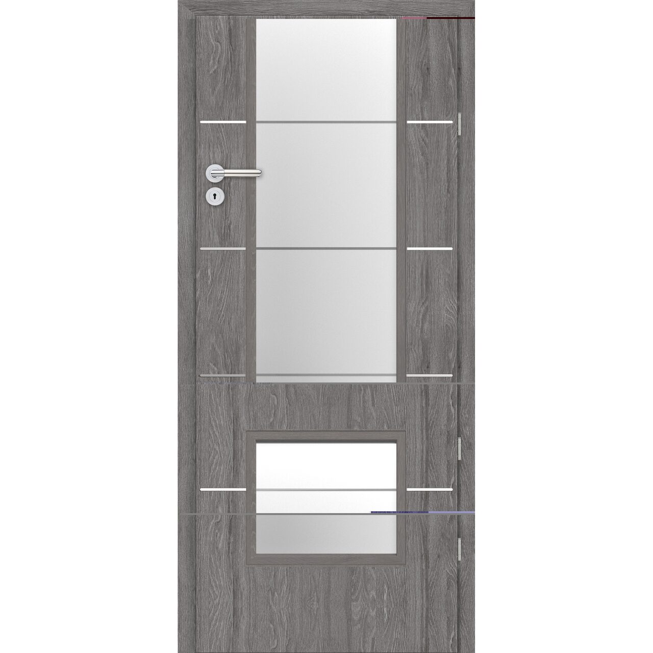 Foaie de usa faltuita, finisaj premium CPL, construita pe structura HARD celulara, sticla sablata si baghete de aluminiu polisat.