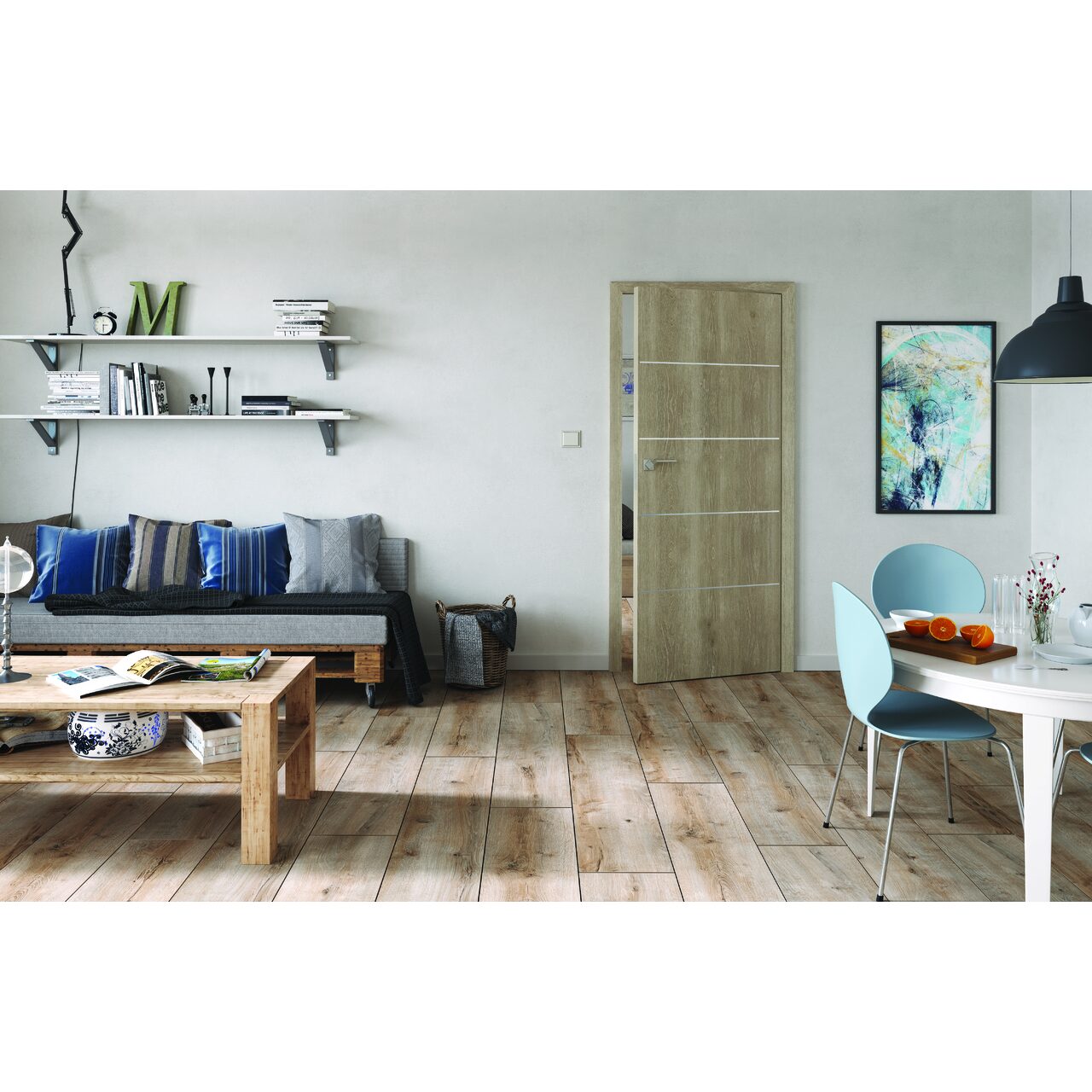 Foaie de usa faltuita, finisaj  premium CPL, construita pe structura HARD cu PAL tubular si inserții din baghete din aluminiu polisat.